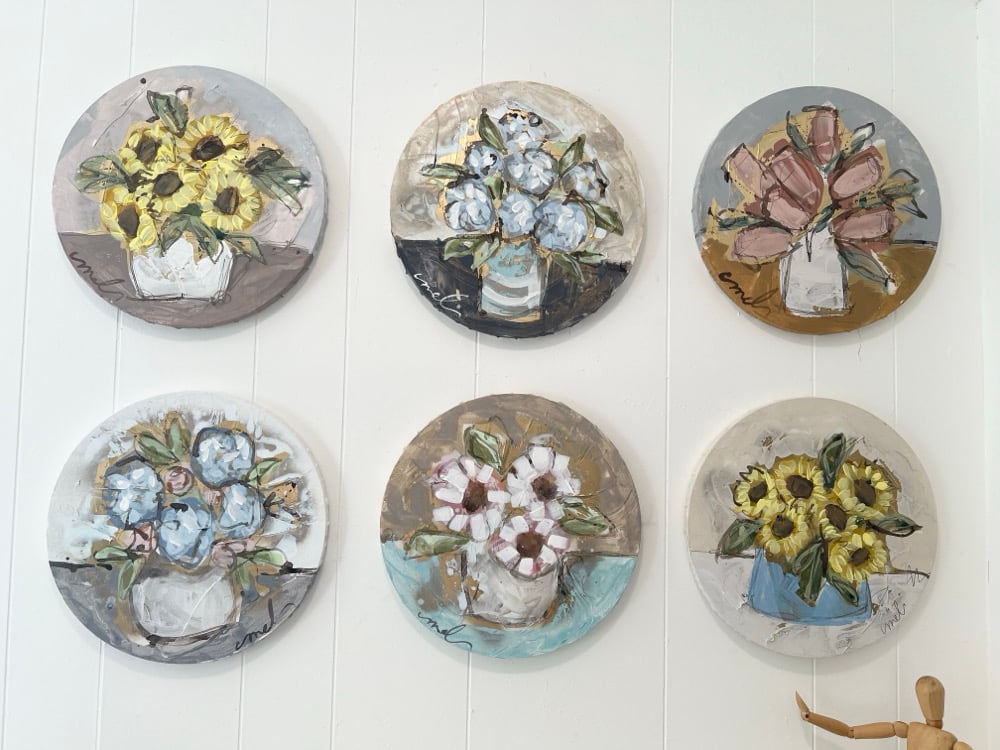 Original painting on 12” round stretched canvas, .75” deep, painted sides. (to pick up at gallery in Mobile, use code LOCALPICKUP at checkout to avoid shipping charges)